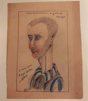 Side by side with Roux’s story, the exhibition additionally highlights the provenance of the works, which were dedicated to Dr. William A. Epstein, who was serving with the 20th Field Hospital of the American Army Medical Corps when the camp was liberated.