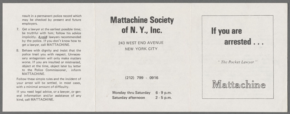 Mattachine Society of New York “If You Are Arrested…”, New York, NY, 1960 Courtesy of the New York Public Library Digital Collections