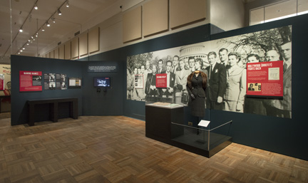 The exhibition is handsomely mounted, with placards that tell the story in vibrant graphics of black, white, grey, and red. There are over 150 objects on display, including pamphlets, personal items from the families of those targeted, letters, and court documents. Using clips from films of the period, as well as footage of testimony from the hearings, a complete sensory environment is created